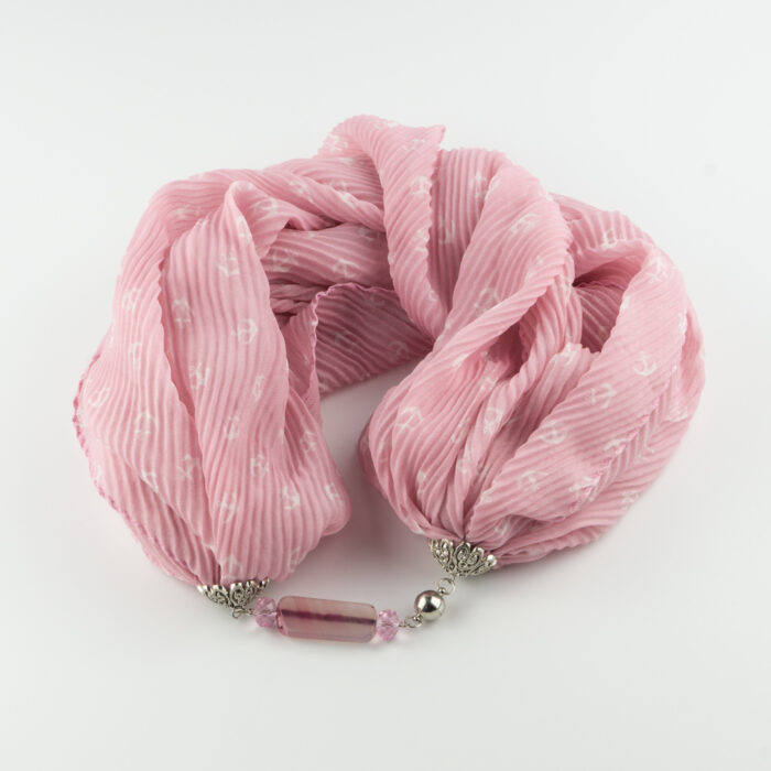 Sciarpina misto seta viscosa plissettata con minuteria in metallo e calamita centrale in agata e cristallo.