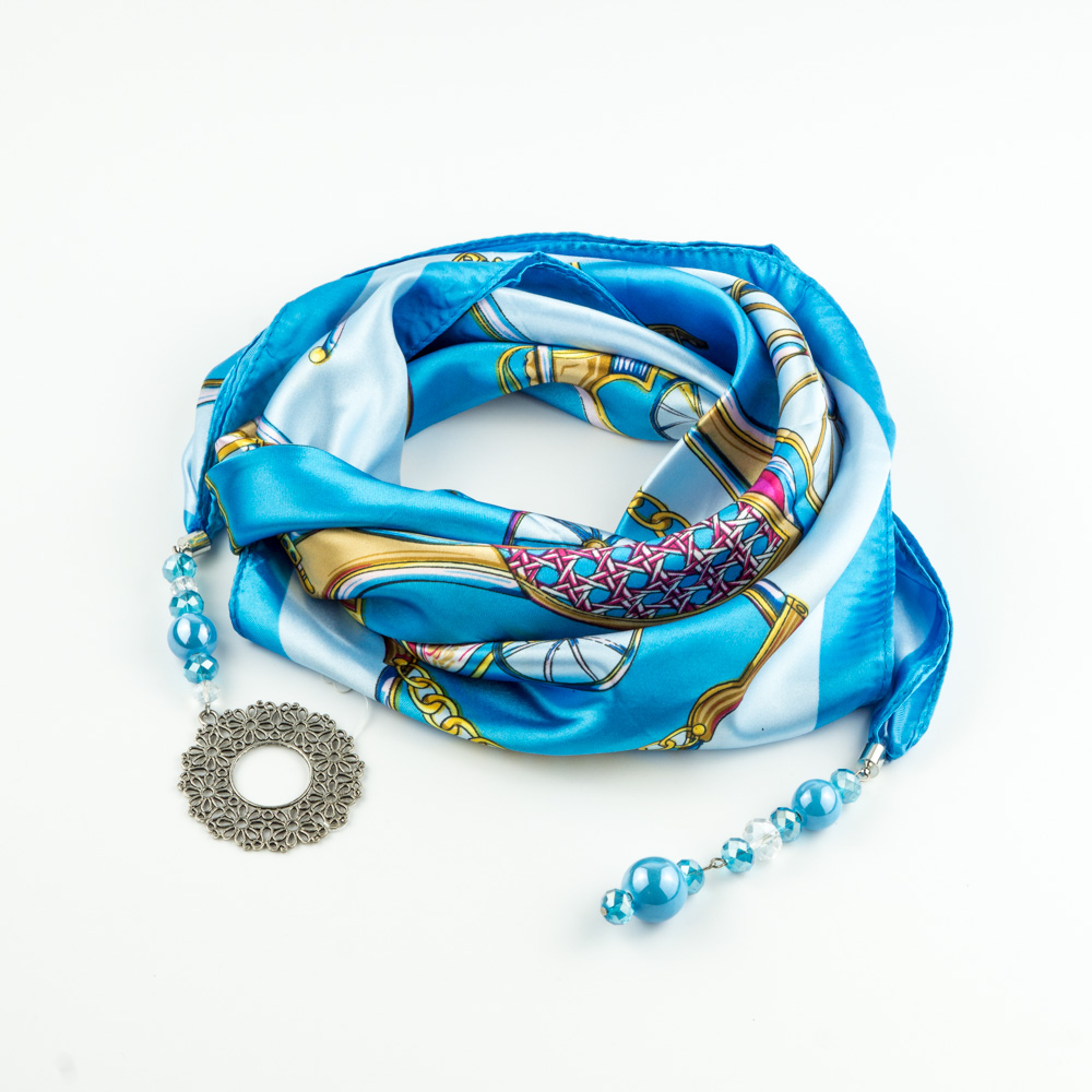 Foularino in viscosa 60x60cm con ciondoli sulle punte in ceramica/pietra dura e metallo.